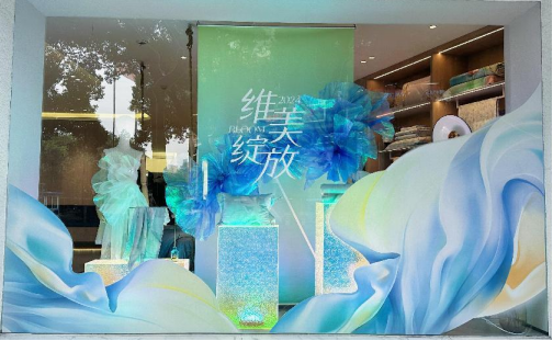 作為發布會場地的維科家紡總店,其陳列布置秉承“維美綻放”主題,將花卉元素與現代風格相融合,打造出一系列充滿想象力和詩意流動的場景。